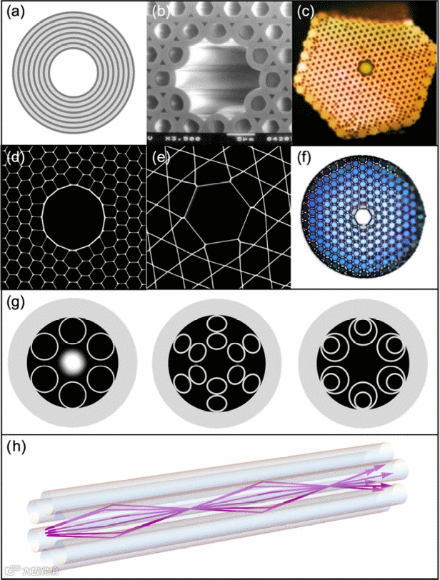 图1:空芯光子晶体光纤结构图集。(a)空芯布拉格光纤结构示意图。对于纯石英包层结构,光栅周期~0.47λ。(b)首个空芯光子带隙光纤的扫描电镜图,纤芯直径为14μm[13]。(c)受到白光激发时,图(b)中光子带隙光纤的导模光斑,展示其光谱滤波特性。(d)经优化设计的光子带隙空芯光子晶体光纤扫描电镜图[14]。(e)采用Kagomé结构包层的空芯光子晶体光纤扫描电镜图[15]。(f)实现白光波导的Kagomé结构空芯光子晶体光纤。(g)具有六重旋转对称性的三种单环空芯光子晶体光纤结构示意图:左图为非接触毛细管环形阵列[16],中图为堆叠毛细管结构[17],右图为嵌套毛细管构型[18]。引入复杂的径向结构可增强径向阻带效应,显著降低泄漏损耗和弯曲损耗。(h)光线在单环光子晶体光纤纤芯内受到径向阻带反射形成的锥形光束。当满足掠入射条件时,其反射率趋近100%。当满足横向谐振条件时,纤芯内将形成稳定的模式。