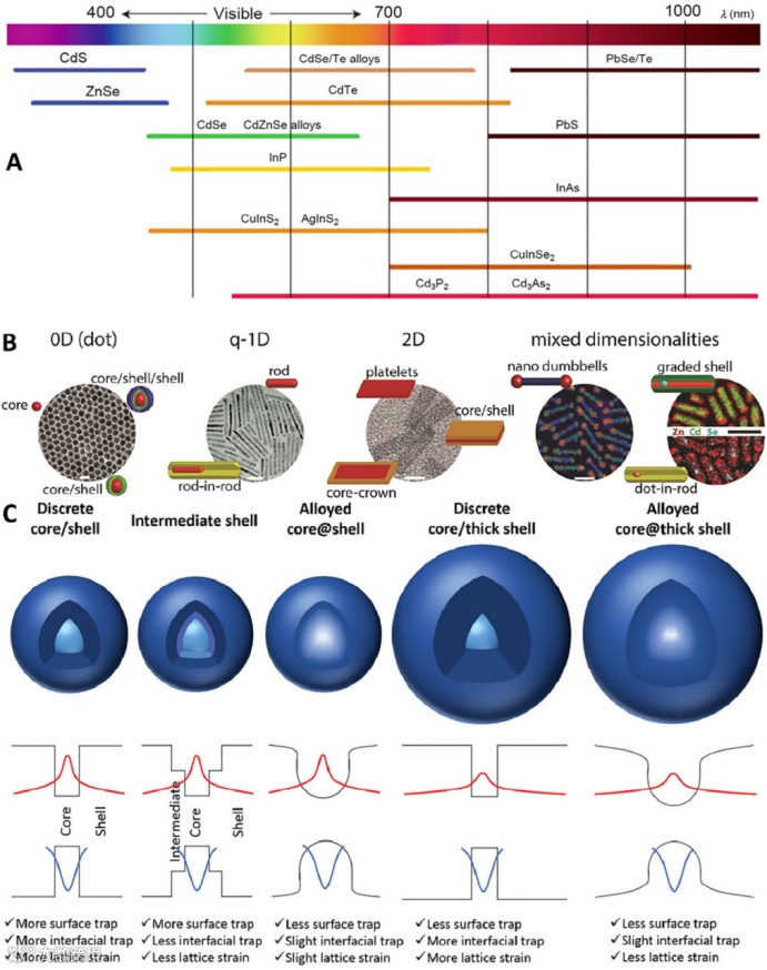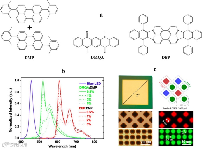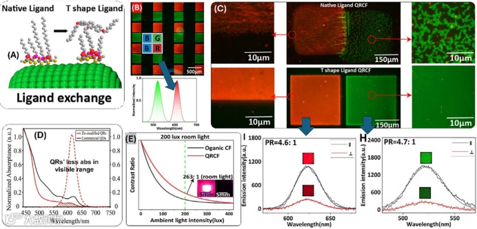 最近,显示设备中的光致发光型彩色滤光片(PLCFs)需求量很大,特别是由于其高饱和度的颜色和更高的显示光学效率。与用于现代显示设备的吸收型彩色滤光片不同,光致发光型彩色滤光片减少了整体显示光的损失,因此,许多发光材料,包括无机磷酸盐、半导体纳米晶体和有机染料,已被研究用于彩色滤光片应用。尽管量子点、量子棒和钙钛矿纳米晶体等纳米材料表现出窄带发射,优于有机染料,但基于纳米材料的光致发光彩色滤光片的制造面临着重大挑战。香港科技大学先进显示和光电子技术国家重点实验室,科研团队在该领域的最新进展。评估了现有技术的可能性和局限性,提出了一种确定潜在颜色转换材料候选者的度量标准,并提出了PLCFs 的性能,还提出了将该技术应用于现代显示器的可能解决方案。
