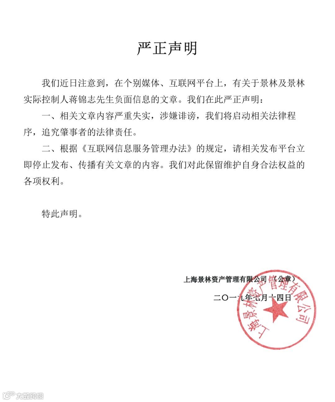 此外,上周日晚间,景林资产还紧急发布了针对这一事件的严正声明。景林资产表示,“相关内容严重失实,涉嫌诽谤”,公司将启动相关法律程序,追究肇事者的法律责任。