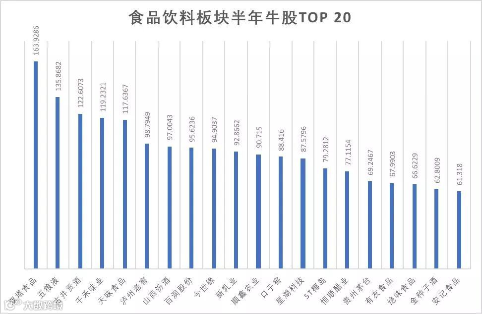 食品饮料板块“第一功臣”称号当仁不让。年初至今,该板块(中信一级)涨幅已经高达60.90%,总市值增加1.36万亿元,特别是白酒和调味品子版块的发力,支撑起食品饮料板块上半年的红火行情。板块牛股多诞生于这两个领域,Wind数据显示,该板块半年股价翻倍的个股有五只,分别为双塔食品、五粮液、古井贡酒、千禾味业、天味食品,均是白酒及调味品龙头股。