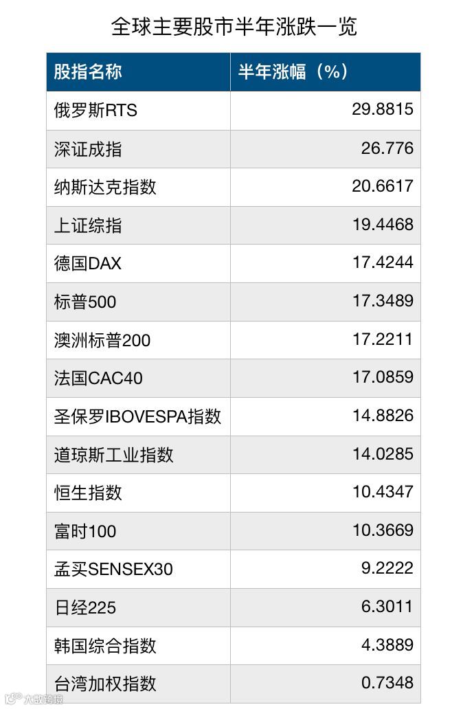 随着6月28日欧美市场收盘,全球股市上半年交易全部结束,各大主要市场成绩揭晓,“龙虎榜”随之出炉。