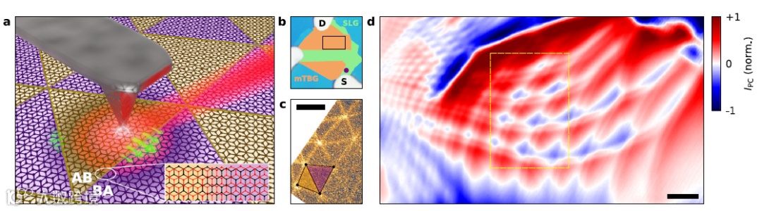 半导体异质结的光响应是现代光电子的核心。光感应电流的一般先决条件是缺乏反转中心,无论它是通过以P-N结形式掺杂不均匀性外在定义的,还是由于晶体结构中反转对称性的破坏而定义的。在这方面,莫尔超晶格的结构非常适用于光响应的应用中,由于晶体的对称性可以由扭转角(容易地减小θ)诱导的原子尺度的重建。最小扭曲的双层石墨烯(mTBG,θ<0.1°)代表此类莫尔超晶格,其中扭曲的双层的晶格重构在能量传输上非常有利,并产生由窄畴壁网络分隔的AB/BA Bernal堆叠区域的交替三角形畴,每层AB亚晶格之间的原子配准通过畴壁平滑变化,在约10 nm的长度范围内极大地改变了局部电子性质。从光响应的角度来看,电子光谱中的那些急剧变化可以用作局部结,从而提供由莫尔超晶格产生的固有光敏区域。虽然这些畴壁网络已被证明强烈影响直流传输和光学性质对于mTBG,尚未对其光电子性质进行研究。
