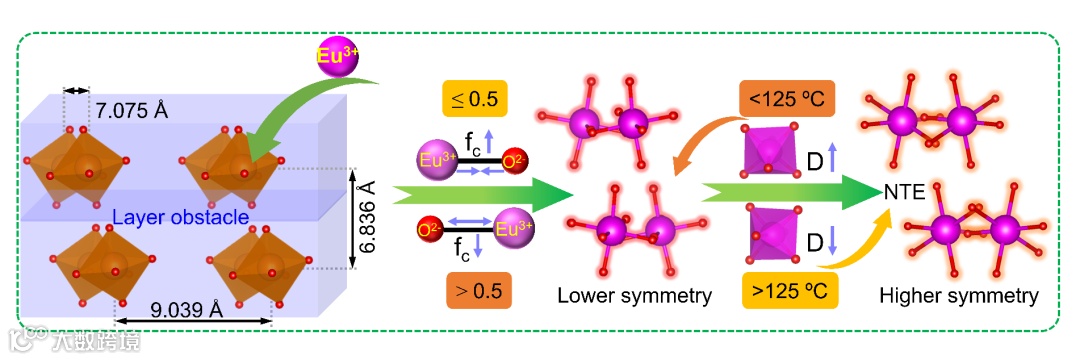 从微观晶体结构出发,揭示了无浓度猝灭发光现象与负热膨胀性能诱导高热稳性的发光机理。作者揭示了Cs3GdGe3O9的晶体结构为一种层状结构,Gd3+离子沿c轴被Cs+离子逐层分离。随着Eu3+浓度的增加,同一层和相邻层的最短Gd-Gd距离变长,有利于Eu3+发射,同时削弱了它们之间的能量转移,从而导致无浓度猝灭。此外,这种层状的晶体结构可以为限制Eu3+离子的层间能量迁移提供层间障碍,从而大大降低猝灭中心捕获有效能量的可能性。在晶格对称性和Eu/Gd-O键共价性的综合作用下,红橙比随着Eu3+浓度的增加而呈现持续增强,实现了高效红光发射。当温度大于150 °C时,基于晶体负热膨胀性能与较小的[EuO6]八面体晶格畸变程度,导致较高的[EuO6]晶格对称性。因此,这种无浓度猝灭红光材料在高温区具有良好的热稳定性。