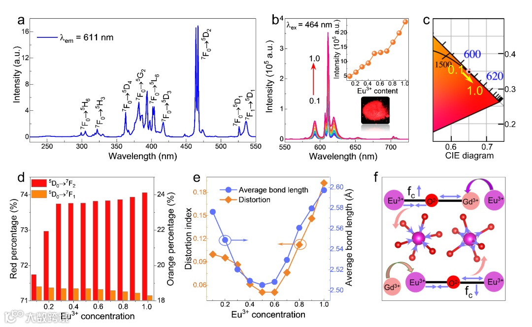 在这项工作中,作者采用传统高温固相法合成一系列Eu3+掺杂Cs3GdGe3O9(CGGO:Eu3+)红光材料,在近紫外和蓝光区具有很强的吸收,随着掺杂浓度增加,未发生浓度猝灭效应。作者将其归因于Eu-Eu之间距离足够长,导致激活离子间的能量转移被削弱,有利于Eu3+的发射。这种无浓度猝灭诱导了Eu3+的无辐射跃迁机会减少,从而提升了红光材料的量子效率(12%→94%)。团队通过晶格畸变以及共价性讨论,分析了红橙比及Eu3+格位对称性情况。结果表明在晶格畸变和共价性的共同作用下,来自电偶极跃迁的Eu3+(611 nm)的发光强度逐渐增强,并且随着Eu3+掺杂浓度增加,红橙比增大,格位反演对称性下降,这种变化导致发光强度持续增强,未发生浓度猝灭。