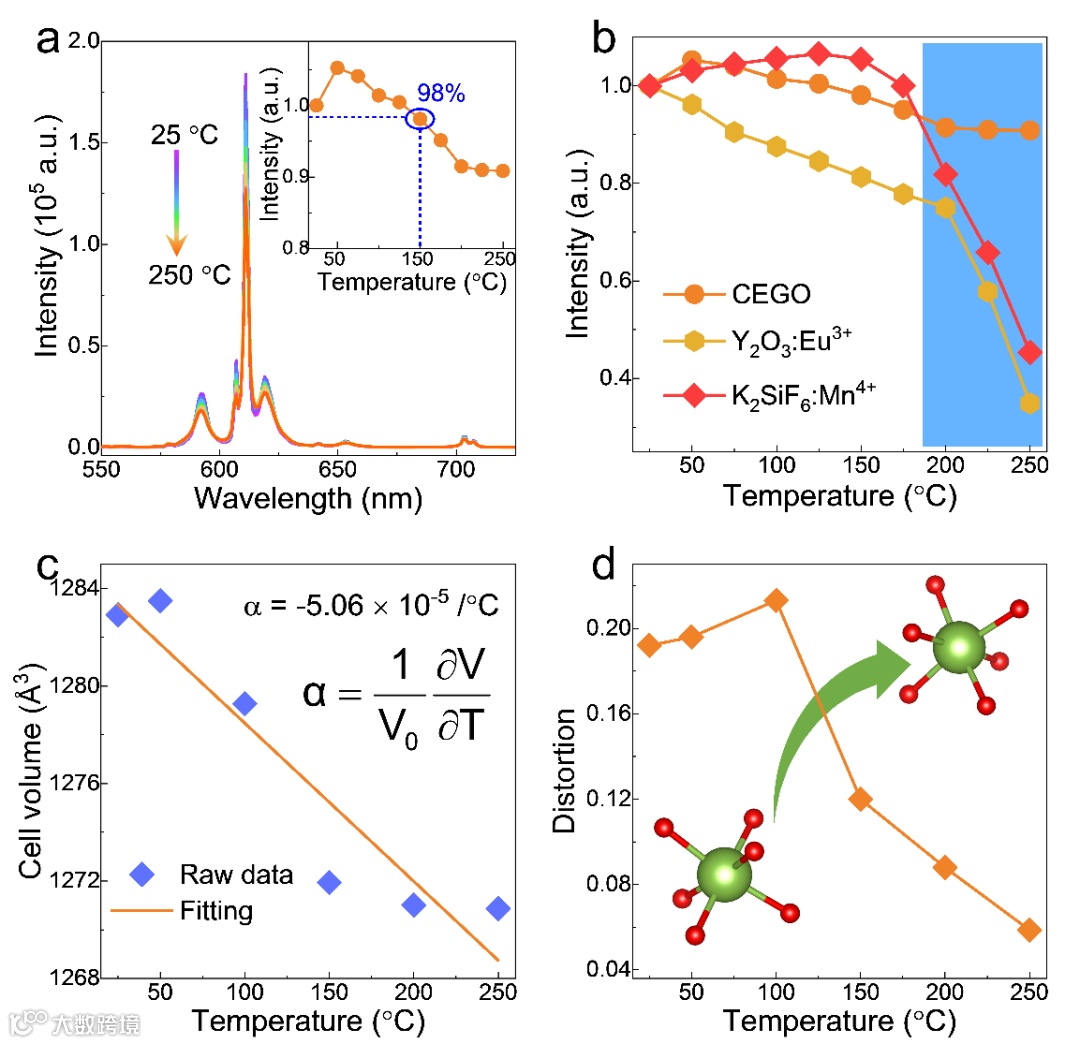 这项工作中,具有正交结构的Cs3EuGe3O9红光材料,表现出良好的热稳定性能,当温度升到150 °C时,发光强度可保持25 °C时的98%;当温度升到250 °C时,发光强度仍可保持90%以上;在高温区域内(175-250 °C),该红光发光材料表现出比商业的K2SiF6:Mn4+和Y2O3:Eu3+红光材料更好的热稳定性能。实际上,Cs3EuGe3O9的正交结构具有多面体连通性,由角共享的半刚性EuO6八面体和GeO4四面体组成。多面体之间的Eu-O-Ge键受到热激发而横向振动,从而引起多面体的协同旋转,并随着温度升高导致单位晶胞体积减小。因此,这种具有正交结构的红光材料在高温范围内可视为负热膨胀(NTE)材料。正是这种负热膨胀性能与强大的结构刚度导致较少的发光热猝灭。这种研究方法为发光材料的晶体结构与热致发光性能之间关联的探究提供了一种思路与借鉴。