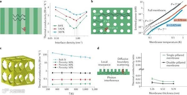 (d)柱状结构导热系数降低的三种机制示意图,双柱撑膜(两侧有柱)和单柱撑膜(仅一侧有柱)的导热系数比相同厚度的均匀膜低两个数量级。