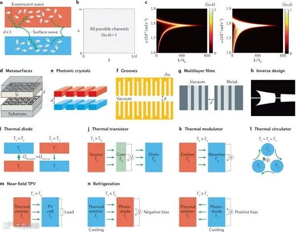 (d-h)增强近场辐射传热的平台包括超表面、光子晶体、沟槽、多层膜和通过逆向设计获得的结构。