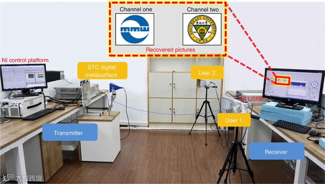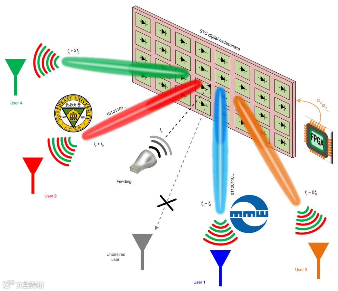 为了进一步提升时空编码数字超表面对电磁信息的强大调控能力,研究人员在该工作中利用时空编码数字超表面来精准地调控电磁波传播方向和谐波频谱分布,集能量辐射和信息调制功能于一体,同时在时间域和空间域编码并处理数字信息。通过优化时空编码矩阵,将信息直接加载到电磁波的空间谱和频率谱特征上,形成了空分复用和频分复用的新体制无线通信方法。根据目标用户数量和空间位置,采用预先设计的直接信息编码方案可以同时、独立地与多个用户进行实时信息传输,无需数模转换和混频过程(如图1所示);同时还具备了方向调制的安全通信特性,在非目标位置的用户无法正确解调信息。