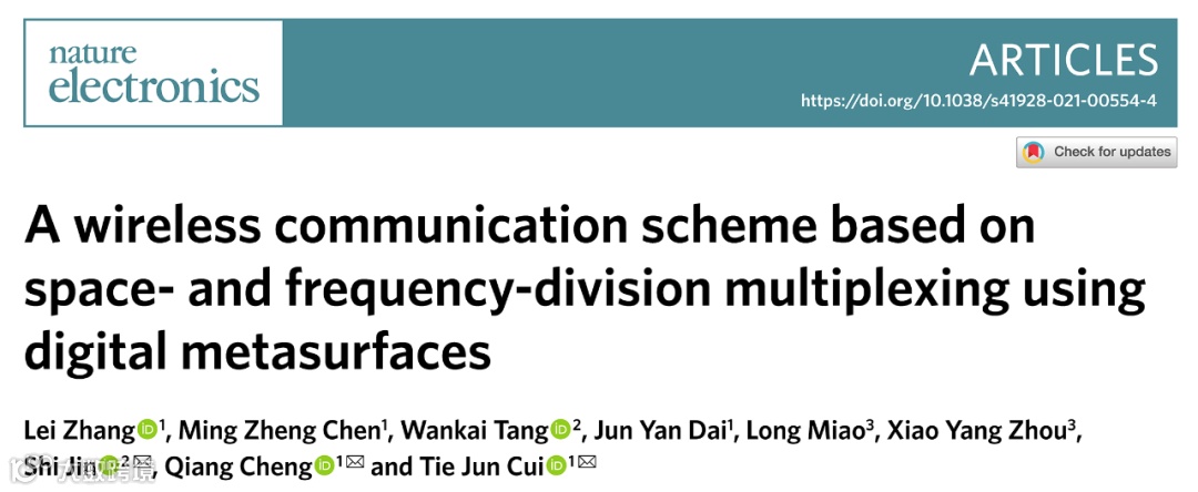总之,这种基于时空编码数字超表面的新体制复用无线通信系统,具有成本低廉和结构简单的优势,省去了传统空分和频分复用技术中所需的天线阵列、混频器、滤波器等射频部件。时空编码数字超表面提供了一种低成本和低复杂度的方案来实施空分和频分复用技术,在未来新体制无线通信和雷达系统中具有广阔的应用前景。美国佐治亚理工学院的Shuai Nie和Ian F. Akyildiz教授在Nature Electronics上以“Metasurfaces for multiplexed communication”为题对该工作进行了专题介绍(Nature Electronics, doi.org/10.1038/s41928-021-00555-3, 2021)。