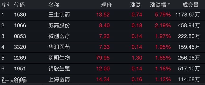 板块内个股多数上涨,截至收盘,三生制药涨5.79%,威高股份涨逾2%。