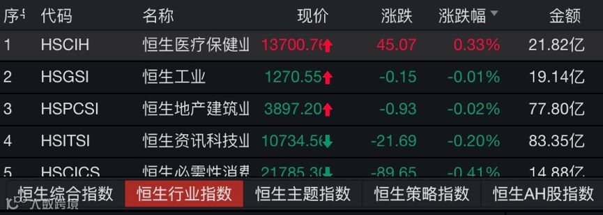 恒生医疗保健业板块早盘高开高走,午后短线下挫,但随后回归涨势。截至收盘,板块涨0.33%,为恒生行业板块中唯一上涨板块。值得注意的是,该板块此前三个交易日均实现上涨。