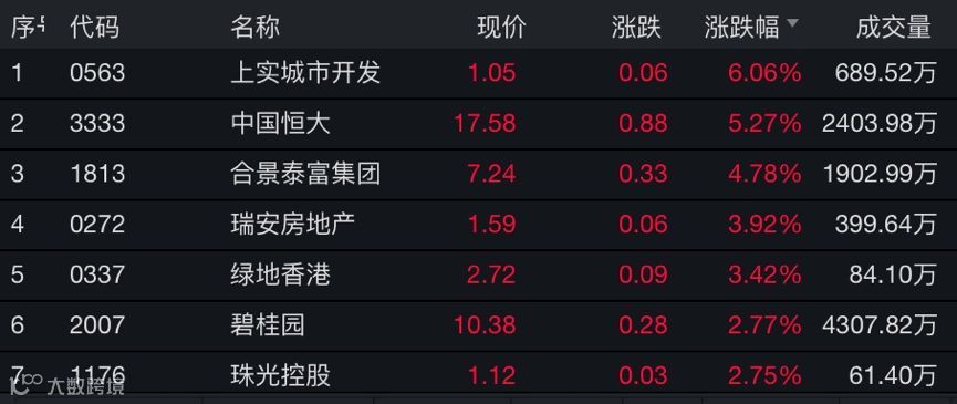 截至收盘,上实城市开发以6.06%的涨幅领涨,中国恒大、合景泰富集团、碧桂园等纷纷跟涨。