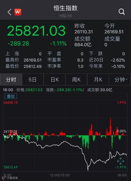 截至港股市场收盘,恒生指数报25821.03点,跌幅为1.11%,大市全日成交量为684亿港元。