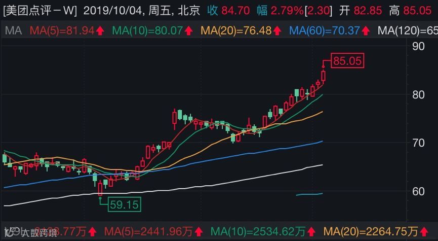 美团点评高开高走,股价盘中高见85.05港元,续创历史新高;收盘时股价涨幅为2.79%,报84.70港元,创收盘历史新高;最新总市值达4912亿港元。