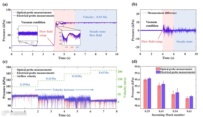 文章对比了光纤压力探针和压阻式电学探头在流场稳定以及动态变化下的测量数据,结果高度吻合。同时,与传统的压阻式探头相比,该光纤压力探针具有更出色的响应能力和检测精度。通过将超小型化设计、高测量保真度、高频采样能力、卓越的稳定性、宽动态范围和抗电磁干扰能力相结合,所提出的光学压力探针在非稳态流场的高空间分辨率测量方面具有巨大的潜力,将推动高性能飞机研究领域的发展。