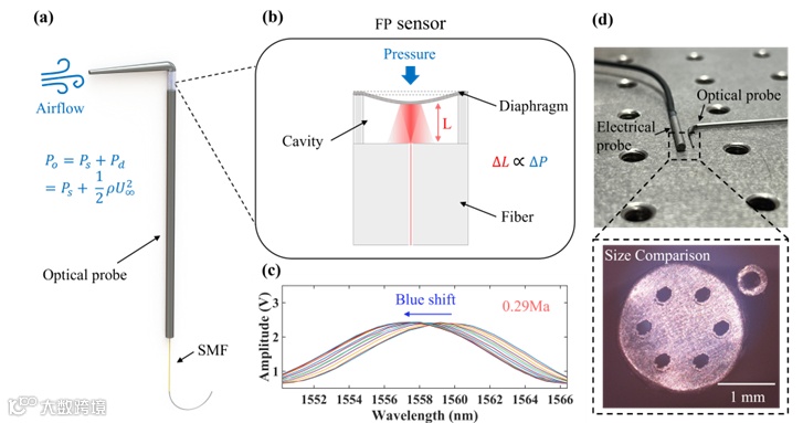 近年来,光纤传感器凭借尺寸小、精度高且抗电磁干扰能力强等优势,在航空航天测量领域显示出巨大潜力。基于光纤法布里珀罗(Fabry–Pérot,FP)传感器的快速响应气动探针已经被成功应用于高速矢量流场测量、高温高压涡轮机械流场测量等场景中。然而,受限于当前微加工技术,目前的光纤FP传感器往往在尺寸大小、使用场景(高温、腐蚀性环境等)以及传感器灵敏度、线性度等参数方面有所取舍。因此,开发能够同时实现小型化、环境适应性强和高线性度等的快速响应气动探针,仍然是极端流场表征领域的一项重要研究挑战。