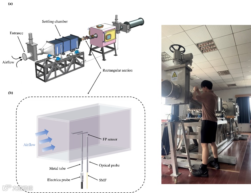图2 (a,b)亚声速风洞流场测量示意图;(c)第一作者现场测试
