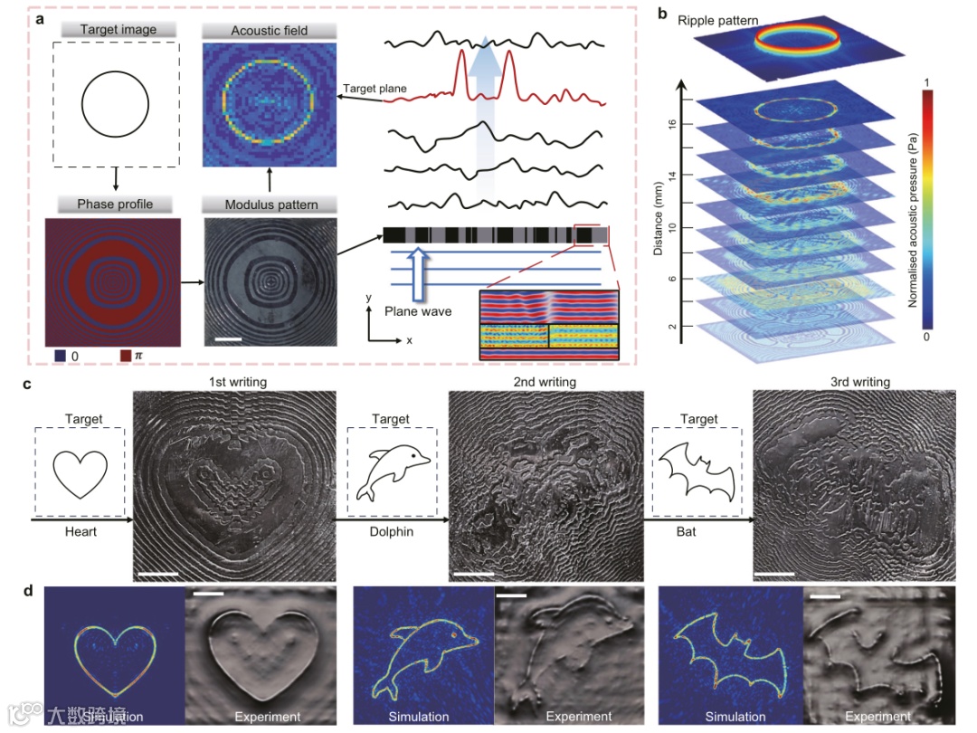 利用迭代角谱算法(Iterative Angular Spectrum Approach,IASA),首先从目标声场图像(例如圆环或特定形状)反推出所需的相位分布,再将相应的“二进制”模量图案在聚合物上写出。当平面声波经过此薄膜时,其相位被局部调制,干涉后在目标平面形成预期的声压分布。实验中,团队成功重建了环形、心形、海豚等多种声图案,且生成的声图案可稳定保持至少9小时(需持续激光扫描维持模量图案)。