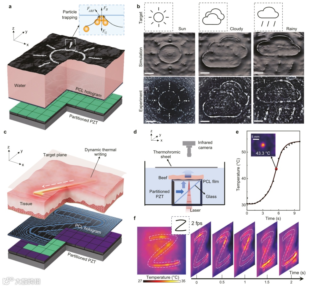 其二是“远程热写入”。声波经相位调制后可穿透约10mm厚的生物组织(牛肉块),在其后的热敏膜上聚焦并局部升温。实验中,声场在目标点使温度于10秒内上升约21°C,并可按设定路径逐点写出字母“Z”的热轨迹。通过调整PZT的开关序列,可实时改变加热路径。