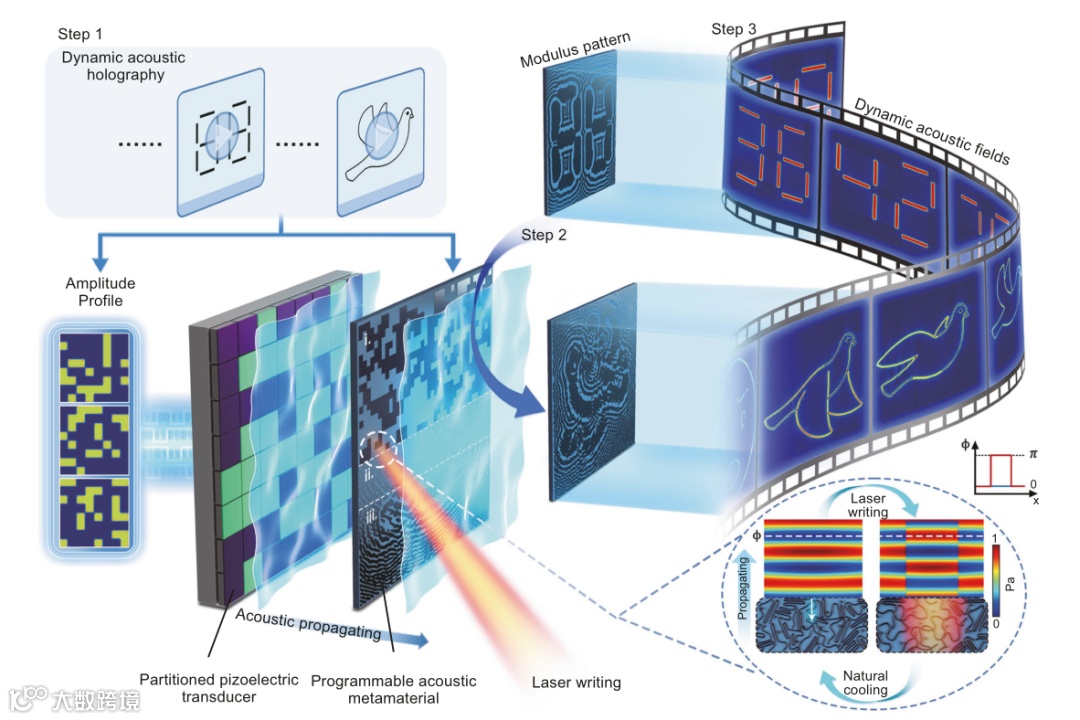 图1 基于可编程半结晶聚合物膜与分区压电换能器(PZT)的可重构动态声全息实现流程。展示整个动态声全息系统的核心工作流程,包括 “激光写入聚合物相位图案→PZT 电调控幅度→生成动态声场” 三个关键步骤。