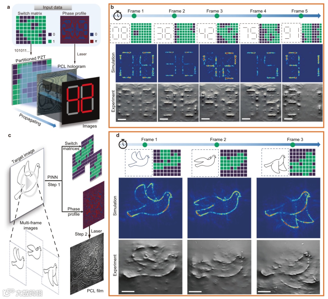 团队设计了一种结合深度学习辅助神经网络(物理辅助神经网络 PANN + 多平面 IASA)的优化流程,将目标声场分解为两个控制变量:聚合物膜的相位分布与PZT阵列的开关矩阵。通过该算法同时优化两者,系统能够以复合调制的方式生成连续动态图像。