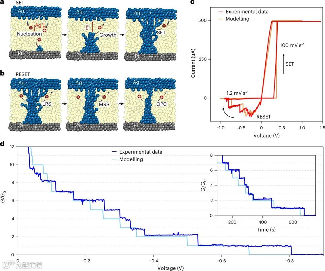 1.基于氧化还原反应的忆阻器件是一种两端纳米离子器件,其结构由两层金属电极夹持离子导电(开关)薄膜构成。这类元件的运作原理和功能依赖于在外加电场作用下,薄膜内纳米尺寸导电细丝的形成与断裂所引发的电阻开关效应。随着纳米金属晶须的逐渐生长,在短路条件下可观测到量子点接触的形成。这种现象通常发生在SET过程(即器件从高阻态转为低阻态的过程)中——该过程由电化学驱动,但具有极高电流密度和强电场特性(图2a)。由于细丝生长过程中尖端与电极表面间距呈指数级缩小,工作时的电场强度会持续增强直至形成金属接触。在此极端条件下,实际控制细丝生长过程极为困难,导致形成接触点的形状、微枝晶/针状体数量及有效面积具有高度随机性。因此,量子点接触的形成极难预测,且在苛刻条件下会形成过粗的细丝。这导致SET过程中形成的量子点接触不仅阻值波动大,即使采用低电压电流仍极不稳定。