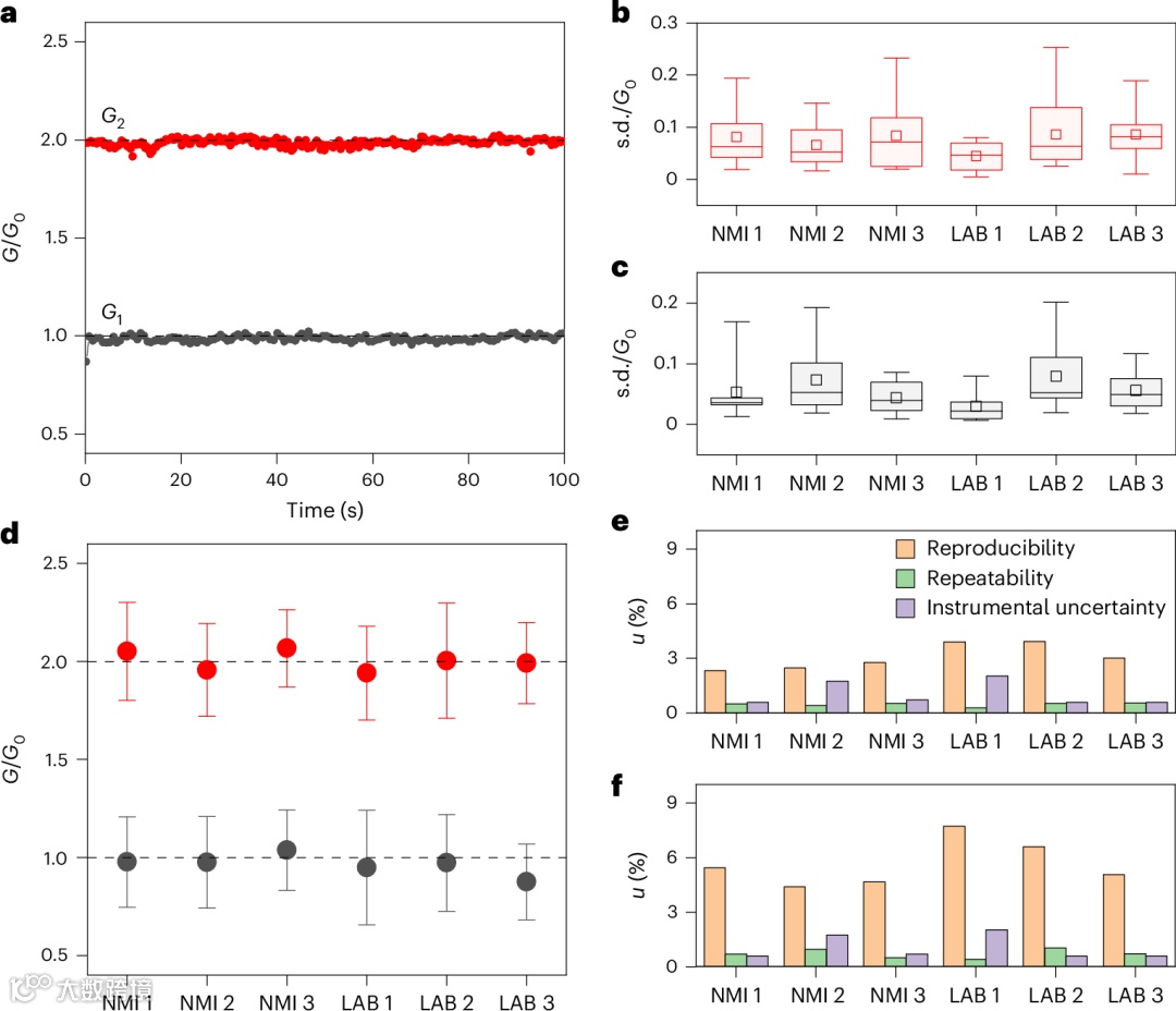 2.图3b,c分别显示所有实验室在G2和G1标准差分布方面具有良好重复性。标准差未随测量时间间隔呈现显著变化趋势,表明基于100秒内短间隔连续测量即可评估重复性对测量结果的贡献。这意味着实际应用中可通过忆阻单元的可编程特性,在需要时按需编程至目标量子电导水平,无需依赖细丝的长期稳定性。