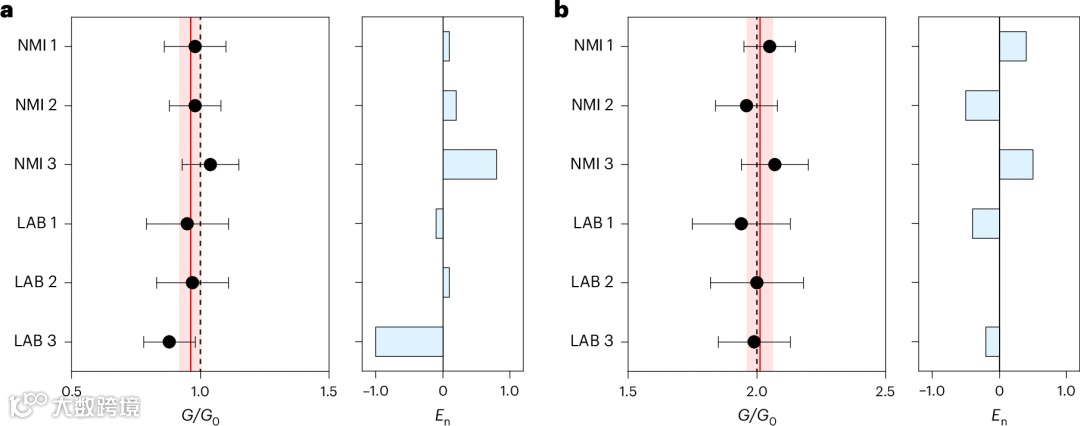 2.图4a和4b分别展示了所有实验室对G1和G2量子能级的测量均值及对应扩展不确定度,以及相对于共识值的归一化误差。通过评估|En|值(所有参与机构均≤1.0)可知,测量的电导值均属于一致性数据集(图4a,b右侧)。经计算,G1和G2的共识值分别为(0.962±0.043)G0和(2.012±0.051)G0。结果表明,G1和G2的共识值相对于预期SI值G0和2G0的误差分别为-3.8%和0.6%。综上所述,共识值与SI值具有一致性,因为其偏离量完全在扩展测量不确定度的覆盖范围内。