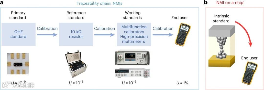1.图1a展示了传统电阻测量溯源链的典型示例。基于量子霍尔效应(QHE)建立的电阻基准标准(具有最高计量特性的标准)已发展数十年,其理论基础为冯·克利青常数RK。值得注意的是,量子反常霍尔效应在计量学中的潜在应用近期已得到验证,该效应可实现零外磁场条件下的电阻标准,但仍需在低温(约35毫开)和真空环境中运行。现有溯源链依赖于将基于QHE的基准标准与一级标准电阻器进行比对,再用后者校准多功能校准仪或数字万用表等二级工作标准。溯源链的每个环节都会导致测量不确定度U的增加,最终用户可能使用的万用表精度仅为1%量级。