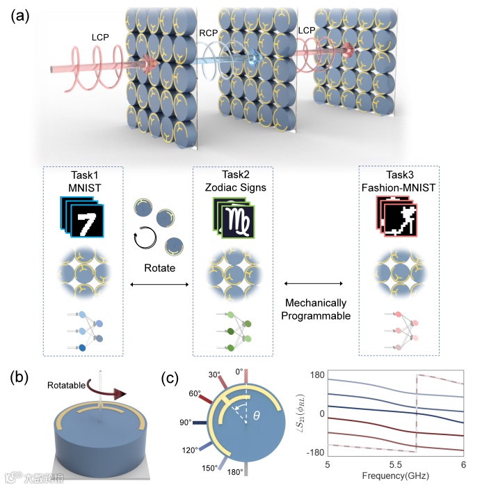 在此背景下,研究团队提出了一种基于Pancharatnam-Berry(PB)相位超表面的机械可编程衍射神经网络(MP-DNN),其结构如图1所示。该网络以可旋转的PB相位超表面为基本单元,通过机械调控各单元的旋转角度,灵活操纵其相位分布,从而赋予整个系统可编程特性与多任务适应能力。实验结果表明,该系统在手写数字识别与星座符号分类等多任务场景中,均展现出良好的机械可编程性与高精度分类性能。