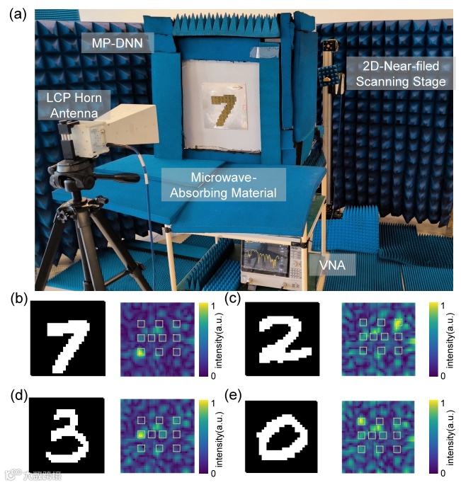 图7 手写数字测试场景与结果。a) 实验装置:左旋圆极化喇叭天线照射MP-DNN输入层,将携带图像信息的电磁波馈入网络;输出场由二维近场扫描仪采集,通过测量x与y极化分量合成圆极化场分布。b-e) 四个测试图像的右旋圆极化输出场分布,显示能量均准确聚焦于目标区域。