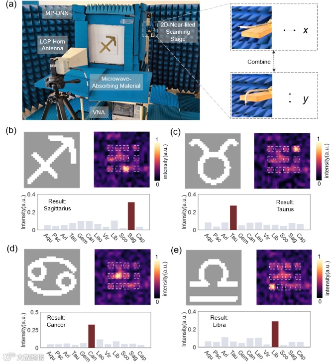 图5 星座分类的实验场景与测量结果。a) 实验装置:左旋圆极化喇叭天线照射MP-DNN输入层,将携带图像信息的电磁波馈入网络;输出场由近场扫描仪采集,通过测量x与y极化分量合成圆极化场分布。b-e) 四个测试图像的右旋圆极化输出场分布,显示能量均准确聚焦于目标区域。