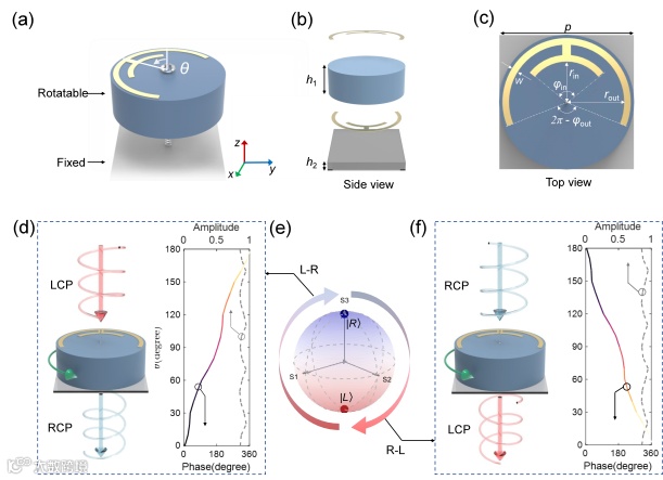 图2 可旋转PB相位单元的结构与特性。a) 单元结构示意图,显示可旋转圆柱单元与固定背板;b) 单元层状结构示意;c) 顶层结构示意图;d) 左旋圆偏振入射下,交叉极化通道(右旋圆偏振分量)的相位随旋转角θ呈二倍线性变化(0°至180°旋转对应0°至360°相位覆盖);e) 庞加莱球示意图:左旋入射时偏振态沿经线由南极向北极演化,右旋入射时则反向演化;f) 右旋圆偏振入射下,交叉极化通道(左旋圆偏振分量)的相位随θ呈负二倍线性依赖(0°至180°旋转对应360°至0°相位递减)。
