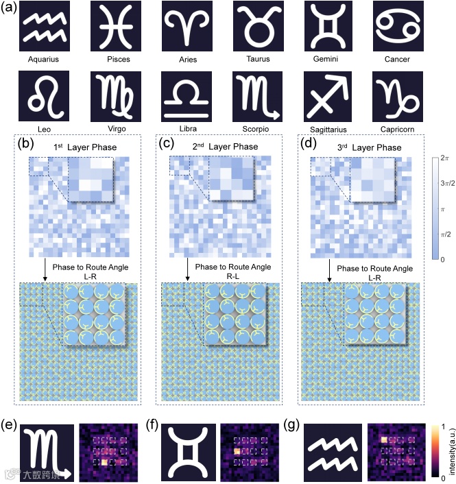 图4 十二星座符号分类。a) 输入数据集示意图,包含从水瓶座到摩羯座共12个类别。b-d) 三层衍射层的优化相位分布及旋转角分布。e-g) 三个代表性星座的输入图像及对应输出场模拟结果,输出场准确聚焦至目标区域。