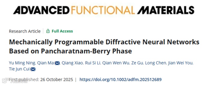 Y. M. Ning, Q. Ma, Q. Xiao, et al. “ Mechanically Programmable Diffractive Neural Networks Based on Pancharatnam-Berry Phase.” Adv. Funct. Mater. (2025): e12689.