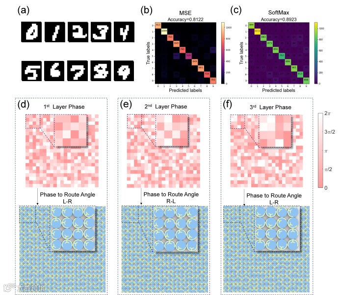 图6 手写数字分类。a) 识别所用MNIST数据集示意图,包含0-9共10类手写数字。b) 测试集混淆矩阵(MSE作为损失函数,准确率:81.22%)。c) 测试集混淆矩阵(SoftMax作为损失函数,准确率:89.23%)。d-f) 三层衍射层的优化相位与旋转角分布。