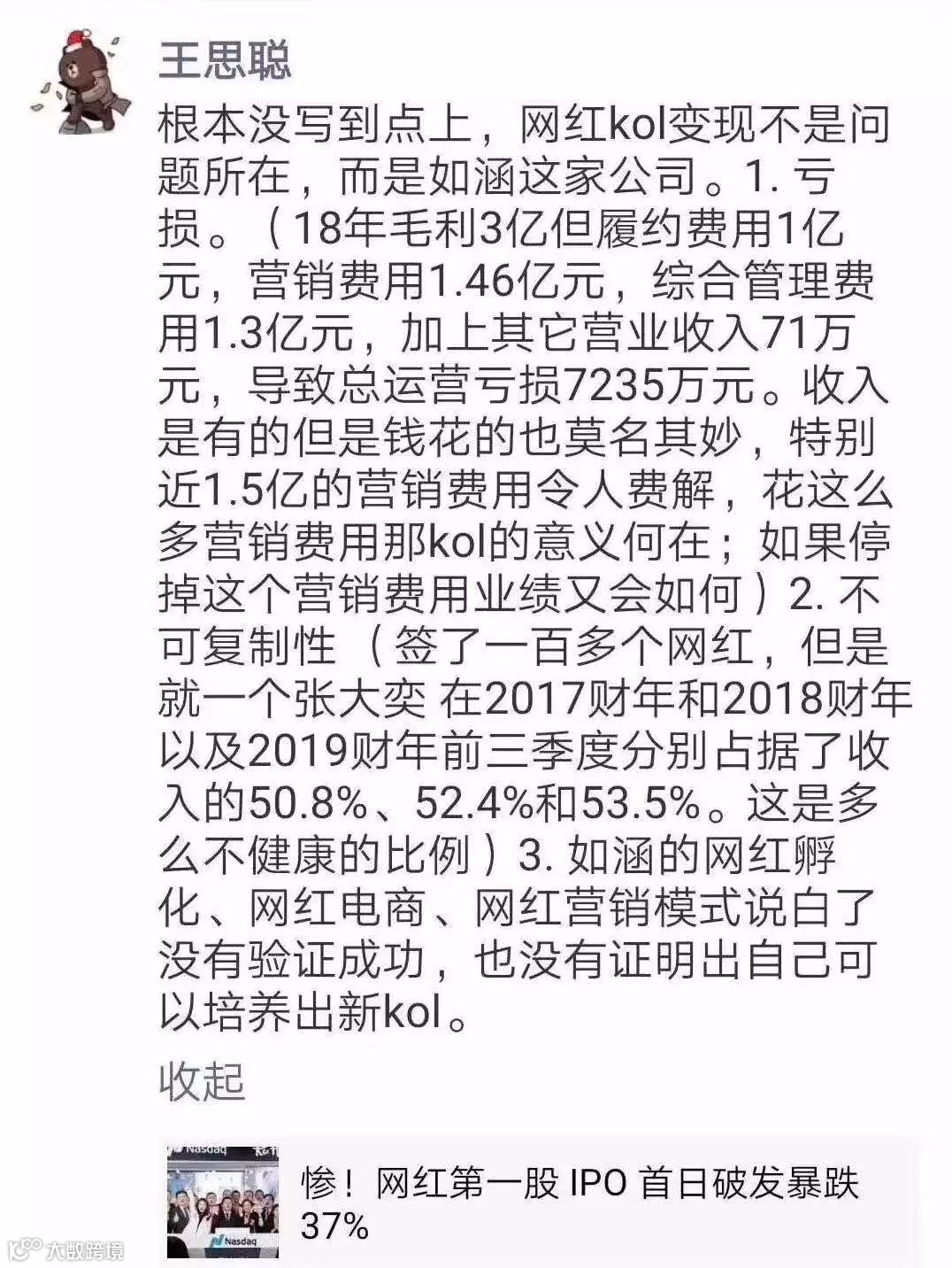 被称为“网红电商第一股”的如涵控股一直不缺乏争议。如涵控股上市首日破发,王思聪曾评论认为:“如涵的商业模式存在三点问题:第一,大笔营销费用令人费解;第二,过于依赖头牌网红张大奕;第三,没有培养出新网红,网红营销模式没有验证成功。”