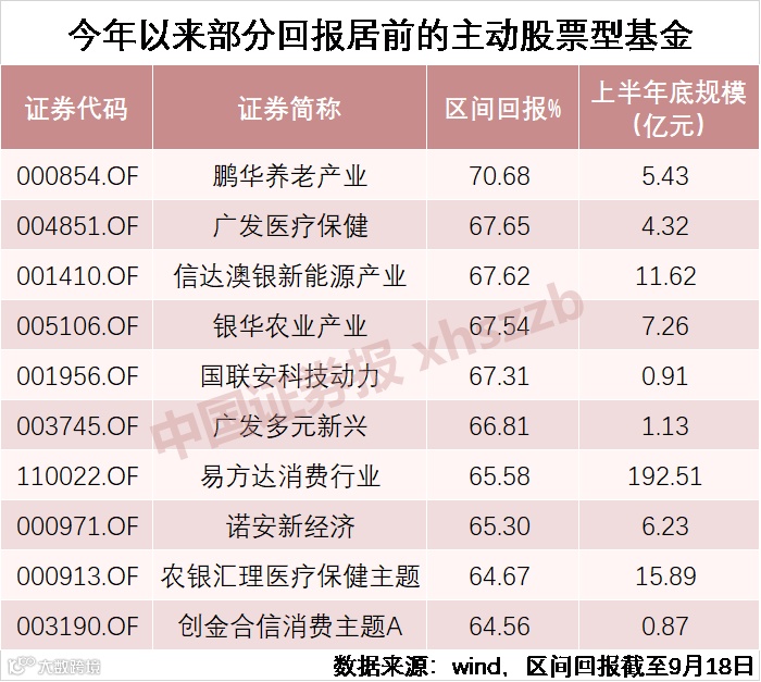 Wind数据显示,截至9月18日,可统计的397只主动股票型基金(不同份额分开计算)今年以来平均收益为32.61%,同期沪深300指数涨幅为29.87%。其中,收益最高的是鹏华养老产业,收益达70.68%。截至9月18日,共有62只主动股票型基金今年以来收益率超过50%。