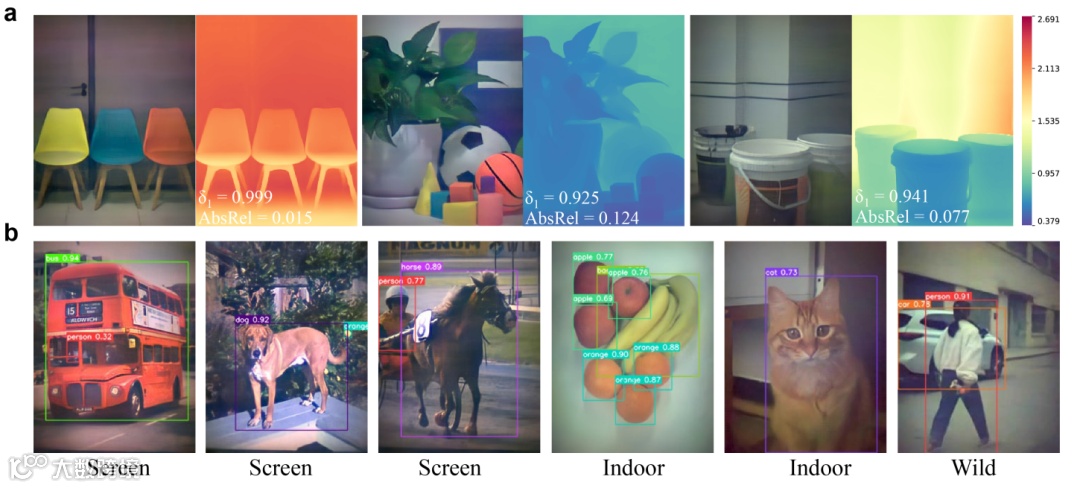 图3:神经阵列超构透镜成像系统深度估计与目标检测任务测试。(a)预训练的DepthAnythingV2模型样机拍摄的图像进行深度估计结果;(b)预训练的YOLOv5s模型对样机拍摄的图像进行目标检测结果