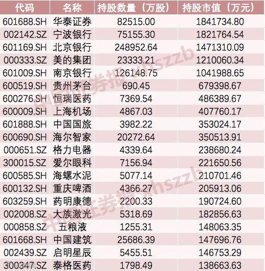 QFII持股市值最高的20只A股(截至2019年6月30日)