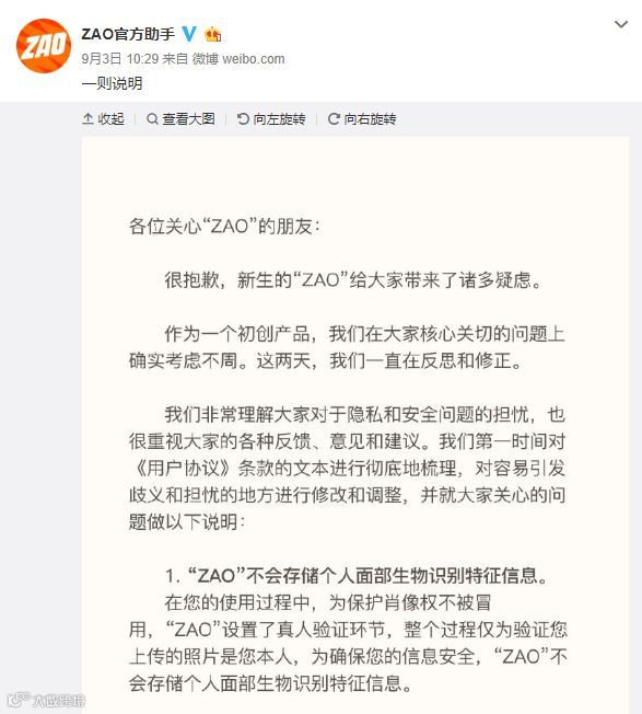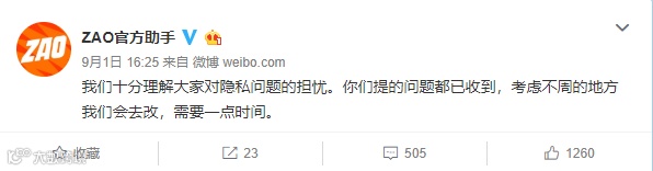 9月1日下午,ZAO在官方微博回应称,会对相关问题进行修改,需要一点时间。