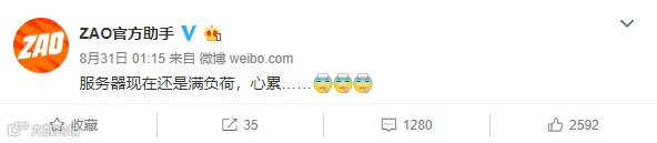 因为过于火爆,8月31日凌晨,距离上线仅仅几个小时,ZAO的官方助手表示,服务器已经“满负荷”运转。