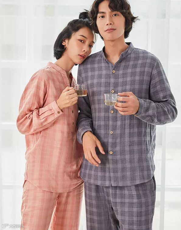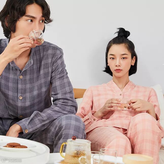 男女皆为格纹款家居服,将经典的小格子加入到家居服,通过立体别致的剪裁,让款式介于家居服和休闲服之间。