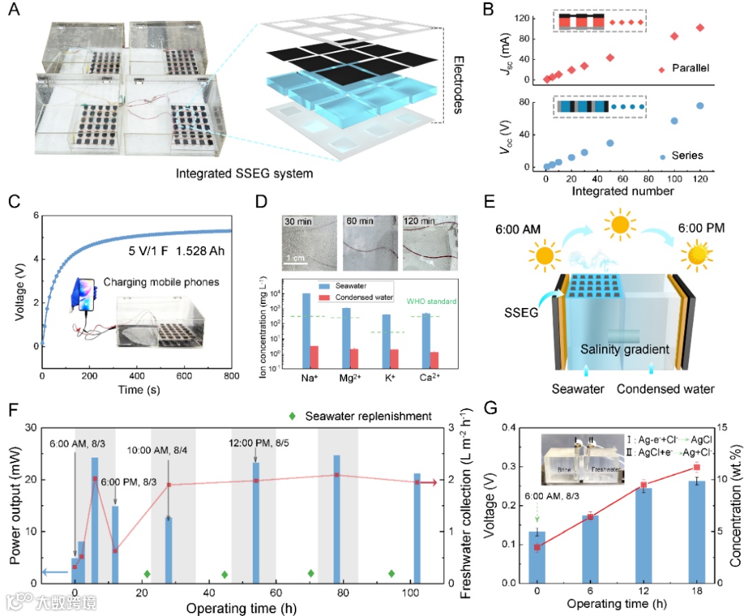 图4. A. 120个SSEG器件“森林式”集成系统;B.串/并联SSEG的输出性能;C. 集成系统充电1 F电容曲线;D. SSEG集成系统中离子浓度对比;E. 集成系统在全天太阳光照下工作示意图;F. SSEG集成系统实时监测的淡水收集速率和发电输出功率;G.反电渗析装置收集渗透能随时间的变化。