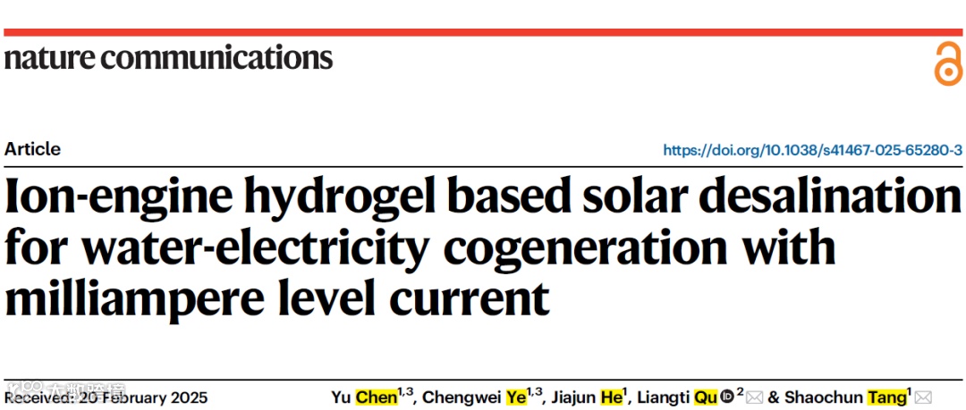 相关研究成果以题为“Ion-engine hydrogel based solar desalination for water-electricity cogeneration with milliampere level current”发表在国际知名期刊Nature Communications上(Nat. Commun. 2025, https://doi.org/10.1038/s41467-025-65280-3)。南京大学现代工程与应用科学学院博士研究生陈玉和叶成伟为论文共同第一作者,清华大学化学系曲良体教授和南京大学现代工程与应用科学学院唐少春教授为该论文的通讯作者。