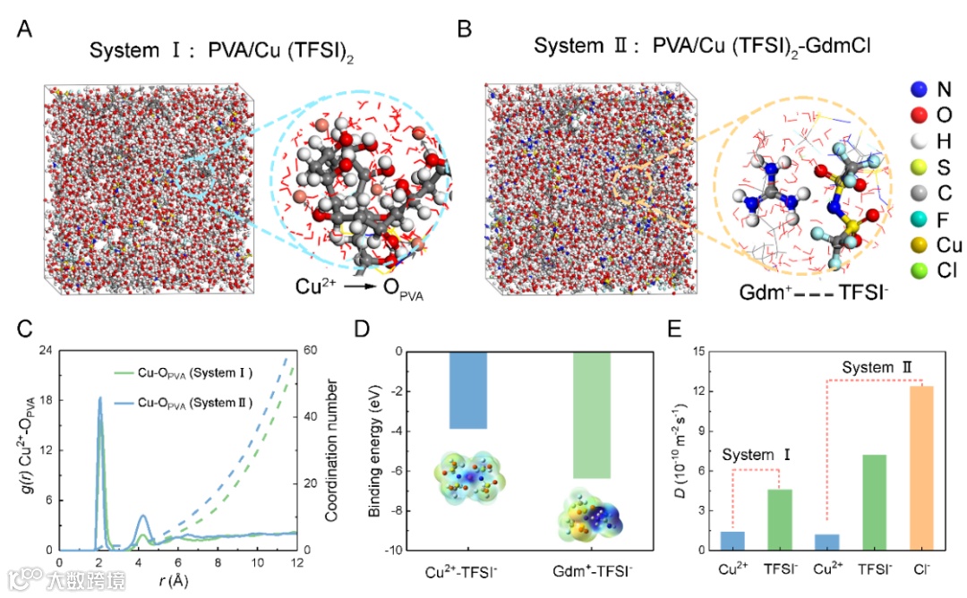 图2. A. PVA/Cu(TFSI)2水凝胶(体系I)分子动力学(MD)模拟;B. PVA/Cu(TFSI) 2-GdmCl(体系II)的MD模拟;C. Cu2+-OPVA的RDF与CN计算;D. Cu2+-TFSI-与Gdm+-TFSI-的结合能及静电势分布;E. 两种体系中各离子扩散系数对比。
