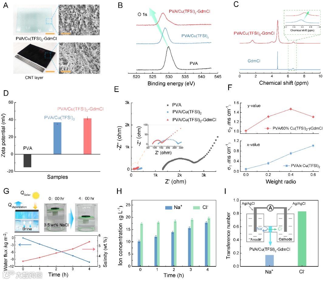 图3. A. 离子引擎水凝胶照片及SEM图;B. O 1s高分辨XPS谱;C. ¹H-NMR谱显示Gdm⁺化学位移;D. 不同水凝胶的ζ电位;E. EIS Nyquist图;F. 不同掺杂样品的离子电导率;G. 蒸发过程中残留溶液盐度变化示意图;H. Na+/Cl-浓度变化情况;I. Hittorf法测得的Na+/Cl-转移数。