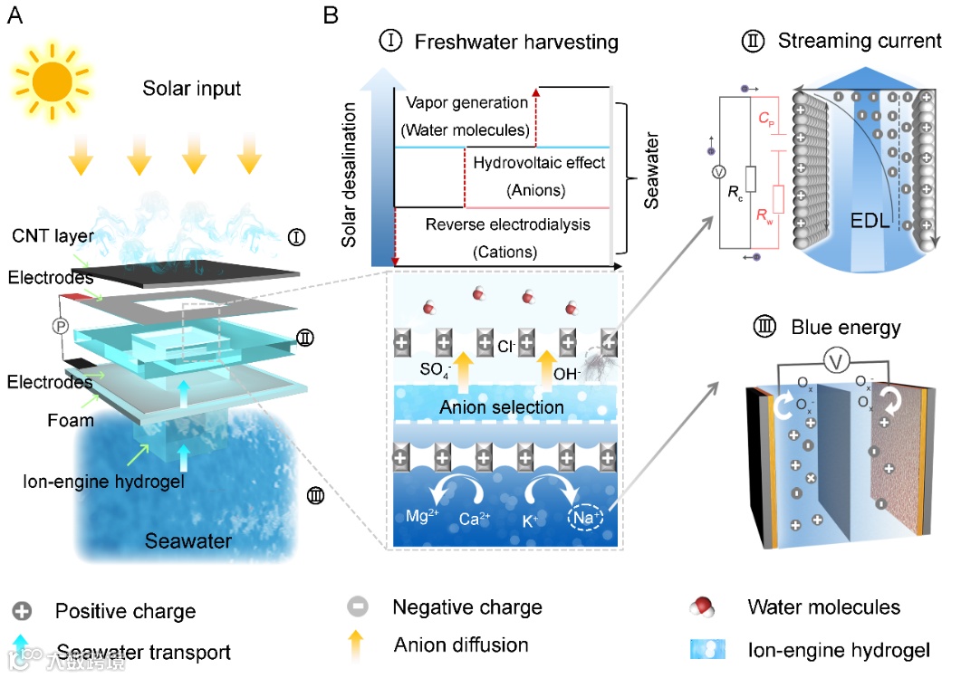 图1A为SSEG水-电联产系统分层结构的示意图,自上而下依次为光热层、顶部电极、离子引擎水凝胶、底部电极、分离层及毛细层。光热层利用太阳能驱动海水蒸发产生蒸汽;离子引擎水凝胶作为核心化学门控元件,在蒸发过程中优先促进阴离子扩散并抑制阳离子迁移。被排斥的阳离子富集于残留浓盐水中,通过反向电渗析转化为蓝色能源(图1B)。这一设计解决了阴阳离子的有效分离及能量多级利用难题,从而实现了以海水为基础原料的最大化水-电联产。