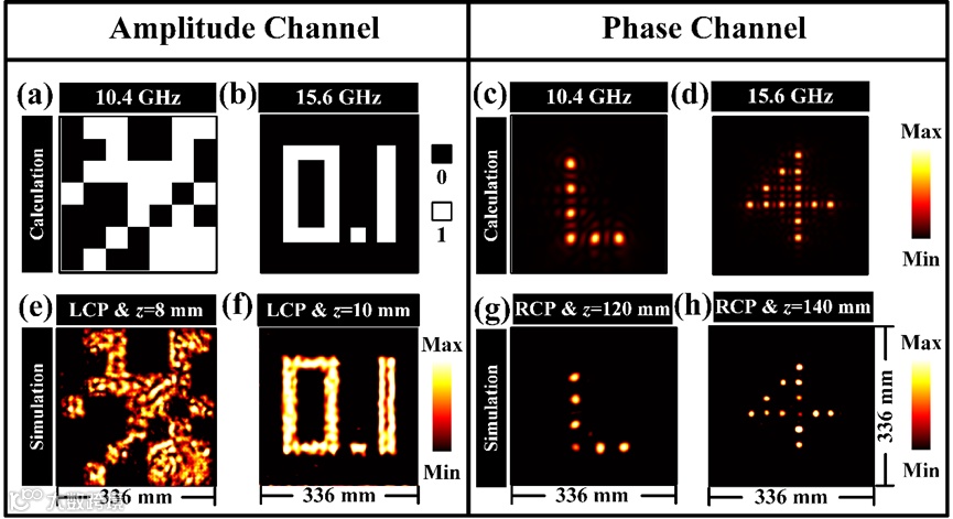 图4.四通道超表面全息加密的计算结果与仿真结果