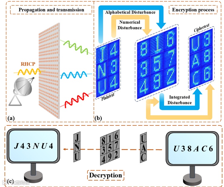 接下来,研究团队通过设计基于像素级涡旋阵列的涡旋光场加密系统,进一步探索安全加密的潜在应用。受经典洛书九宫格加密方法的启发,并结合基于权重的叠加处理,将其整合到所提出的超表面框架中,以实现动态和高度安全的编码。在这种方法中,随机生成的数字序列和目标明文字母序列组合在一起,构建一个联合矩阵。通过嵌入基于权重的九宫格系统,对矩阵的数字和字母部分分别施加干扰。受干扰的数字结果进一步用于调制字母元素,形成一个组合加密层。最后的加密矩阵通过“之”字形扁平化过程变成一维编码序列。
